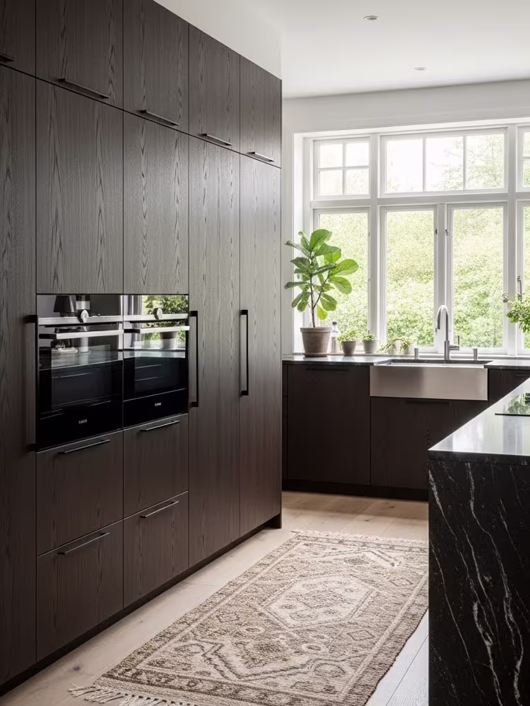 Smoked Oak kitchen – dark oak paired with marble, balancing depth and Nordic elegance.