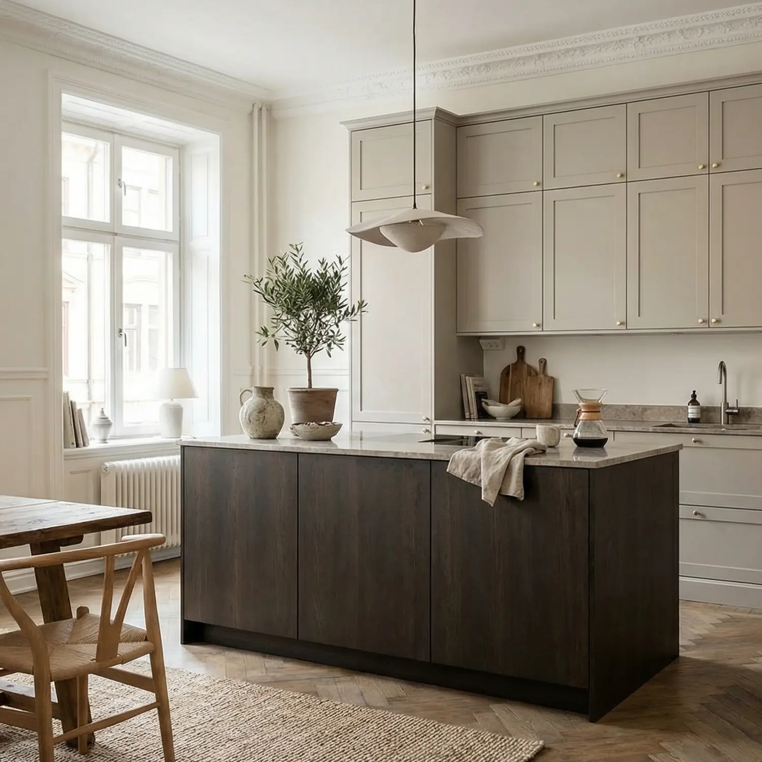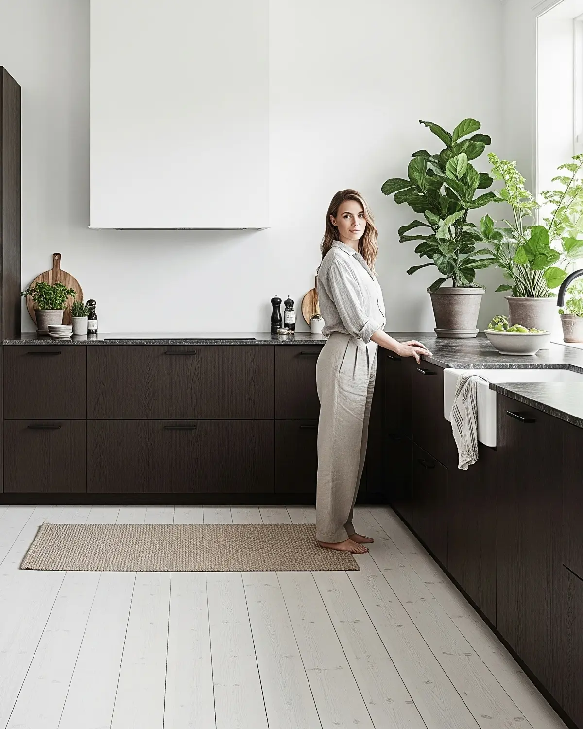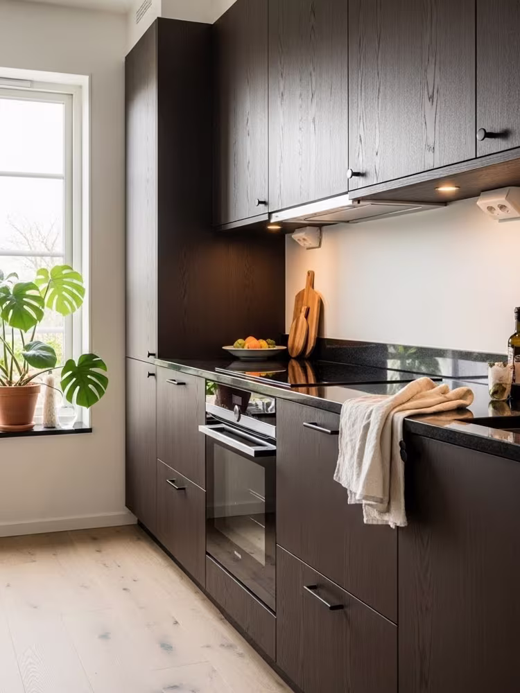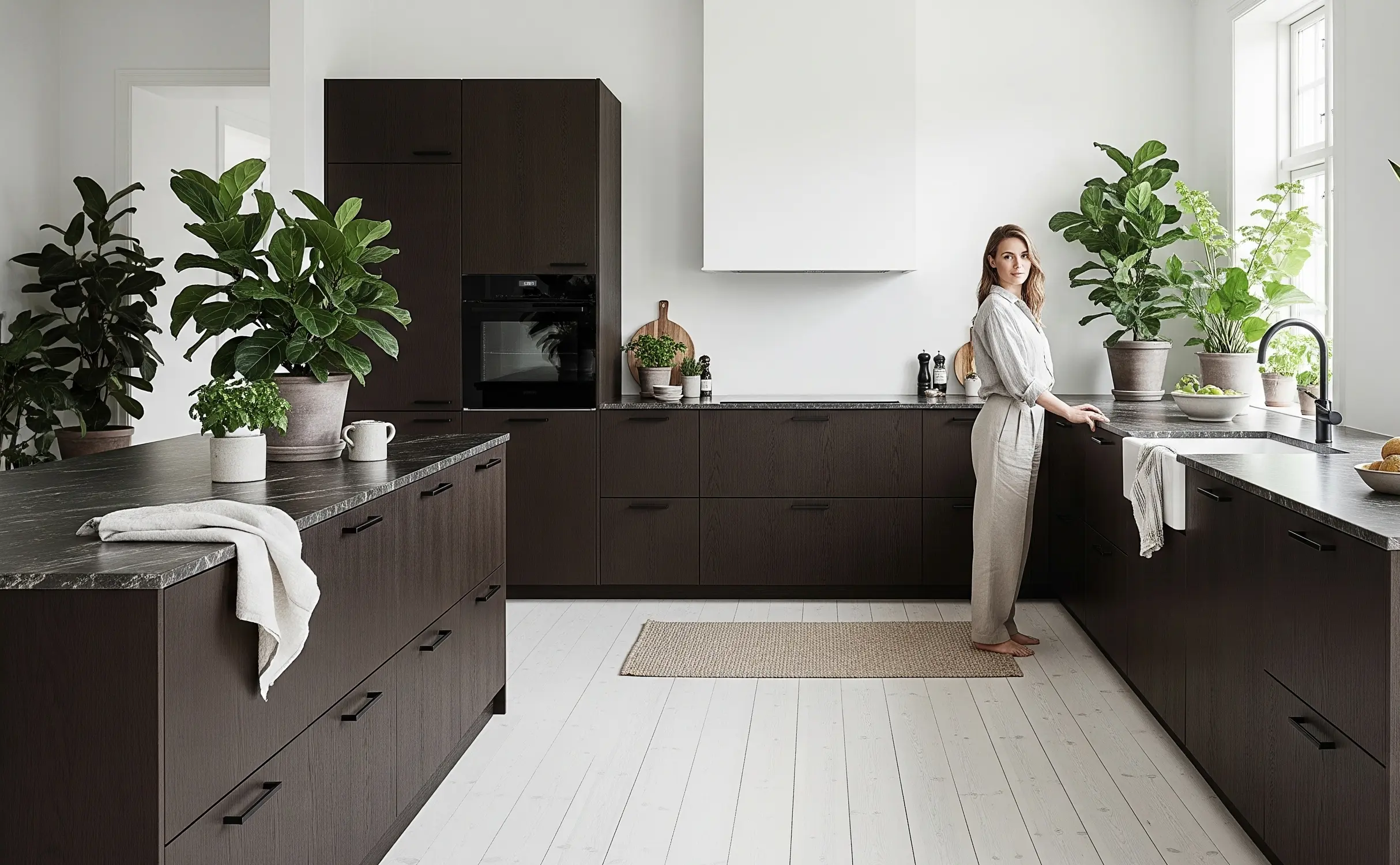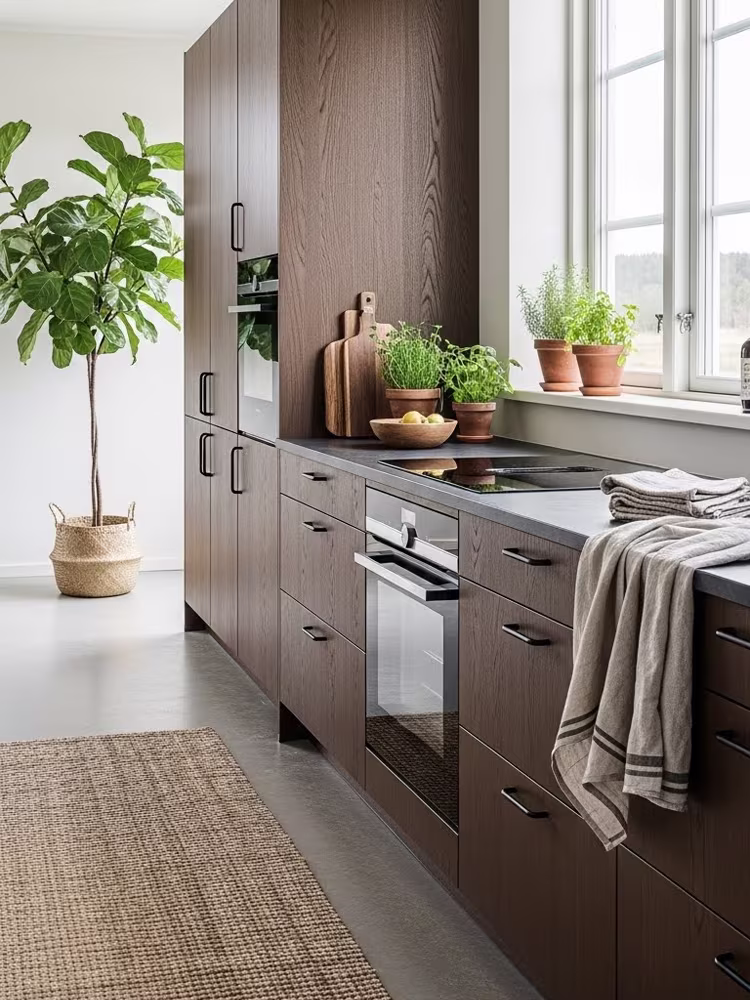 Smoked Oak kitchen – rich tones framed by daylight, creating a calm and timeless Nordic atmosphere.